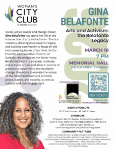 “We are honored to welcome Gina Belafonte to Cincinnati,” said Beth Sullebarger, President, Woman’s City Club. “Her work in arts activism and community engagement reflects our mission to educate, empower, and engage citizens in promoting the common good, and her voice adds vital insight as we work together for a more just and inclusive community.”
